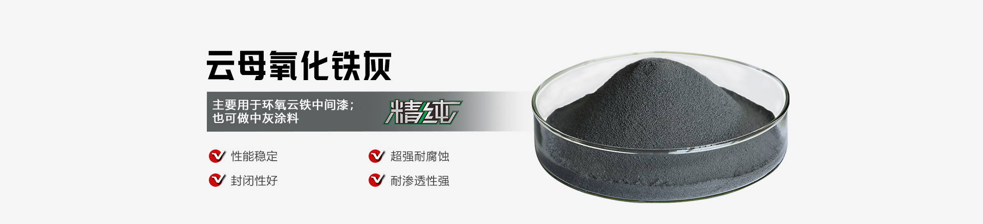 云母氧(yang)化(hua)鐵(灰)是(shi)一種化(hua)學(xue)性(xing)能(neng)穩定的片(pian)狀(zhuang)顏料,不易與(yu)酸(suan)、堿、鹽等(deng)起(qi)反應,耐(nai)高溫(wen),無毒;其閃亮度(du)高,徑厚比大,質地細膩,色(se)澤純正,粒(li)度(du)分布科學(xue)。在漆膜中具(ju)有特(te)別(bie)好的封閉性(xing)和耐(nai)候性(xing),光敏性(xing)弱,對腐蝕介質及水(shui)汽(qi)等(deng)均有很強的耐(nai)滲透和隔絕(jue)能(neng)力,并(bing)能(neng)大量(liang)吸收和反射(she)紫外線。通過(guo)改性(xing)處理,在水(shui)性(xing)體系里防腐性(xing)能(neng)優異(yi)。