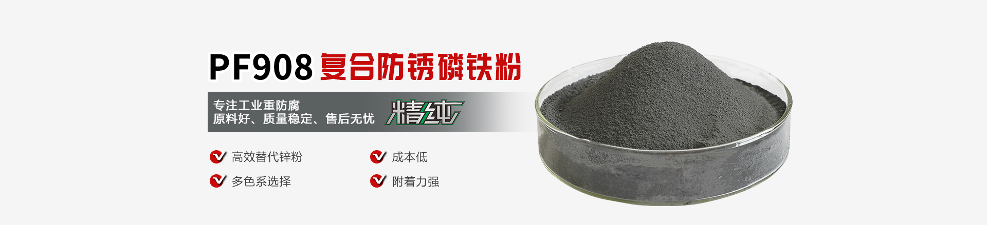 PF908復合防銹磷鐵粉經(jing)改性(xing)以及超微細化處理。產品(pin)無(wu)毒、無(wu)味,具有成(cheng)本低,效能高,附著力強,硬度高,超強耐腐(fu)蝕等(deng)優勢;并且經(jing)過(guo)改性(xing)處理后,在水性(xing)體(ti)系中(zhong)具有良好的分散性(xing)能。廣泛用于汽車(che)、集裝箱、船舶、鋼結構,生產導電漆、重防腐(fu)富鋅漆,是涂料行業降低成(cheng)本、提高產品(pin)競爭力的理想換(huan)代產品(pin)。