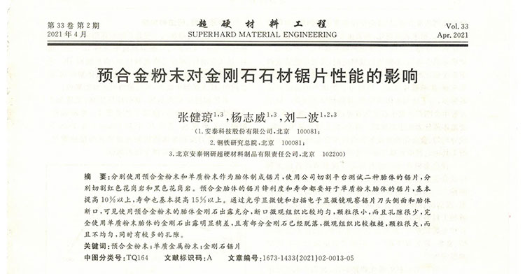 2021年4月10日,張健瓊、楊志威、劉一波等專家學者在超硬材料行業聞名期刊《超硬材料工程》第33卷第2期發表了《預合金粉末對金剛石石材鋸片性能的影響》一文。……